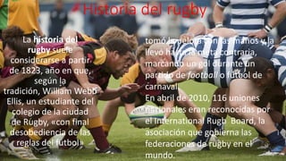 El documento proporciona información sobre la historia y las reglas del rugby. Explica que William Webb Ellis inventó el rugby en 1823 al tomar el balón con las manos durante un partido de fútbol. También describe que en abril de 2010 había 116 uniones nacionales reconocidas por el International Rugby Board y que durante el siglo XIX se desarrollaron las reglas del fútbol entre los colegios privados de Inglaterra dando origen al rugby y fútbol modernos.