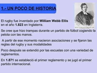 El documento resume la historia y las reglas básicas del rugby. El rugby fue inventado por William Webb Ellis en Inglaterra en 1823 cuando agarró el balón con las manos durante un partido de fútbol. Con el tiempo se establecieron asociaciones y reglas formales para el deporte. El objetivo principal es anotar un ensayo al dejar el balón en el suelo detrás de la línea de ensayo. El rugby tag es una versión para niños que no involucra contacto físico, sino quitarle el pañuelo al port