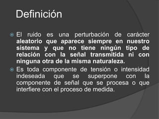 El ruido es una perturbación aleatoria que interfiere con la señal deseada y puede clasificarse en ruido correlacionado y no correlacionado. El ruido correlacionado está presente solo cuando hay una señal y puede derivarse de distorsiones en la señal, mientras que el ruido no correlacionado proviene de fuentes externas y componentes internos de dispositivos electrónicos. La relación entre la potencia de la señal y el ruido es crucial para evaluar la calidad de la señal en sistemas electrónicos.