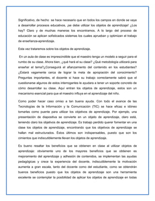 Este documento discute el papel de los objetos de aprendizaje virtuales en la enseñanza. Explica que los objetos de aprendizaje son herramientas esenciales para que los maestros influyan en el aprendizaje de los estudiantes y mejorar el proceso de enseñanza-aprendizaje. Algunos beneficios de usar objetos de aprendizaje incluyen mejorar la comprensión de los estudiantes, aumentar la motivación de maestros y estudiantes, y hacer que temas complejos sean más fáciles de