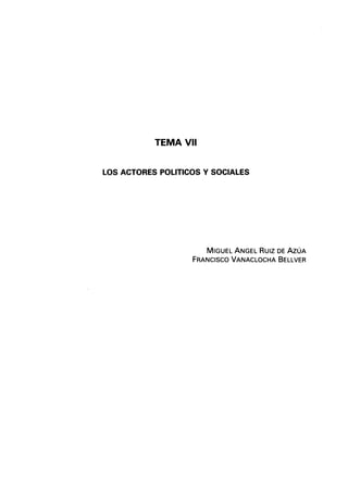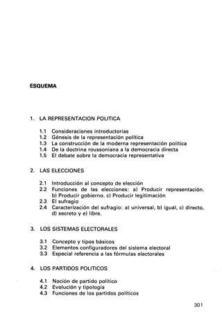 Este documento discute la representación política y los actores políticos y sociales. Explica la génesis de la representación política desde las asambleas estamentales medievales hasta la construcción del modelo moderno de representación nacional y generalizada. También analiza conceptos como la representación libre, los partidos políticos, los grupos de presión y el comportamiento político.