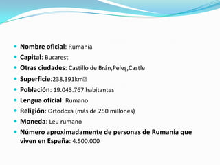 Rumanía tiene como capital Bucarest, y otras ciudades importantes incluyen Castillo de Brán y Peleș. La lengua oficial es el rumano y la religión predominante es la ortodoxa. Transilvania es el hogar de muchas leyendas de vampiros, incluyendo la historia de Drácula. Algunos platos típicos rumanos son sarmale, ciorba y mamaliga. Lugares notables incluyen el Castillo de Drácula en Bran, Sibiu y sus murallas medievales, y el pueblo conservado de Sapanta
