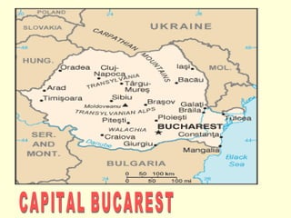Rumania es un país situado en el sureste de Europa, miembro de la UE y la OTAN. Tiene una población de 22 millones y capital Bucarest. Limita con Ucrania, Moldavia, Hungría, Serbia y Bulgaria. El clima es templado continental con cuatro estaciones. La gastronomía incluye platos de carne como mititei y sarmale. El territorio es mayormente montañoso, con el Danubio como río principal. La cultura rumana conserva tradiciones como el folklore y los trajes populares.