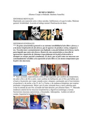 Este documento describe los síntomas mentales y físicos asociados con dos plantas medicinales: Rumex crispus y Ranunculus bulbosus. Rumex crispus se asocia con depresión, irritabilidad, sensibilidad al aire frío, tos, dolor de garganta, diarrea y erupciones cutáneas con picazón. Ranunculus bulbosus alivia los efectos del alcohol y se asocia con miedo, delirio, dolor de cabeza, náuseas, dolor abdominal, disnea y dolor torácico. Ambas