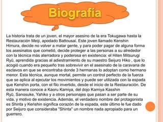 La historia sigue a Kenshin Himura, un joven que fue el temido asesino conocido como Battousai, quien decide no volver a matar y se dedica a proteger a los demás con su espada de filo invertido. A lo largo de su viaje, Kenshin forma lazos con personajes como Kaoru Kamiya, una maestra de kendo que cree en proteger a los demás, y otros amigos que comparten sus ideales. A pesar de su pasado oscuro, Kenshin busca redimirse y utilizar sus habilidades para el bien.