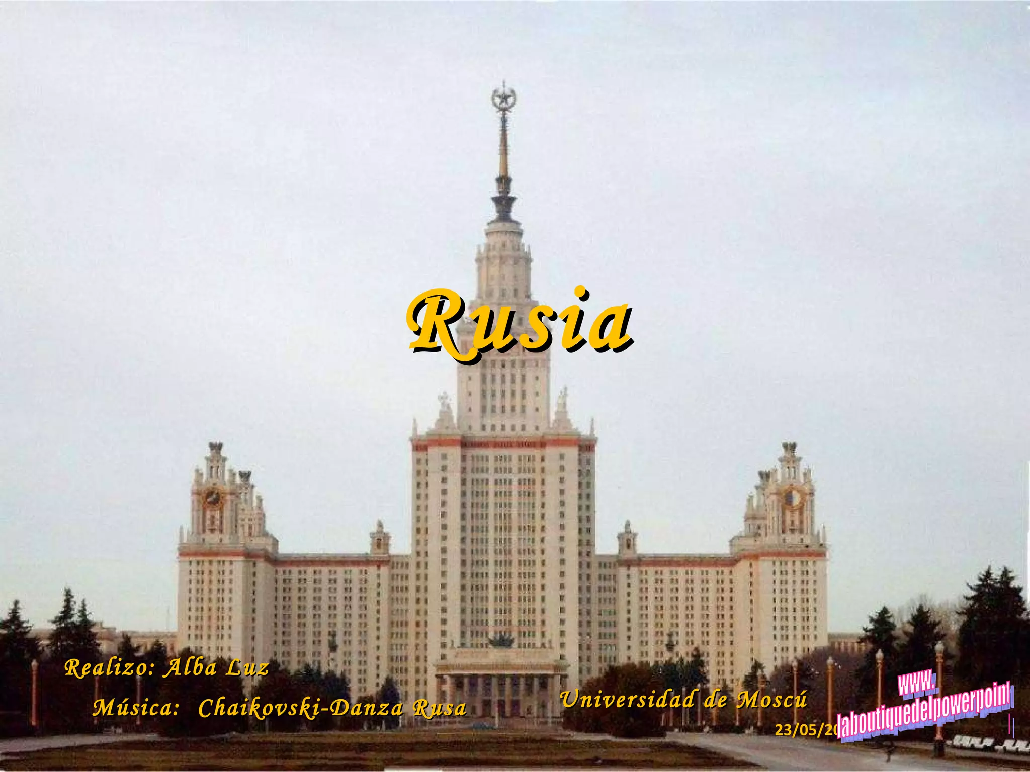El documento presenta una serie de fotos tomadas en una visita a Rusia el 23 de mayo de 2009, mostrando lugares emblemáticos de Moscú y San Petersburgo como la Universidad de Moscú, la Iglesia de la Sangre Derramada, el Kremlin, la Catedral de San Basilio y la Plaza Roja, así como paisajes de los jardines del Kremlin, el río Moscova y vistas nocturnas de las ciudades.
