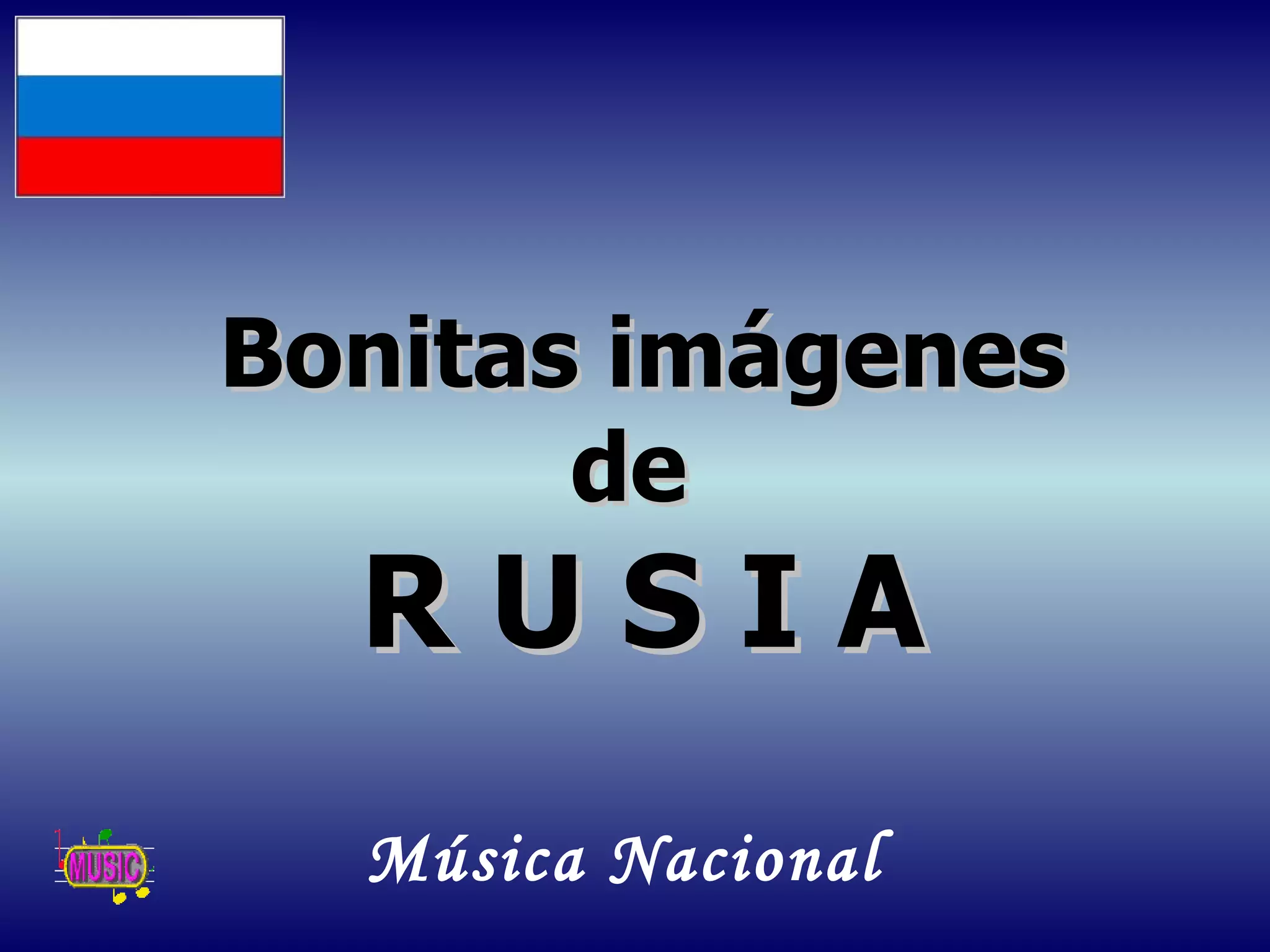 El documento presenta imágenes y descripciones breves de varios lugares y monumentos históricos de Rusia, incluyendo Moscú, San Petersburgo, Kiev y el Kremlin. Entre las fotos se muestran catedrales, palacios, teatros, plazas y parques de las principales ciudades rusas, así como escenas del folclore y la vida cotidiana del país.