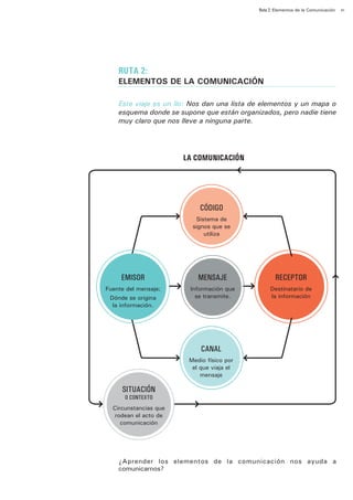 Este documento presenta una guía para trabajar la comunicación en el aula a través de rutas de lectura. La Ruta 2 se enfoca en los elementos de la comunicación como el emisor, mensaje, receptor, código y contexto. Incluye reseñas de libros que exploran estos elementos, sugerencias para conversaciones y actividades creativas como escribir cartas o crear personajes en código ASCII. El objetivo es ayudar a los estudiantes a comprender y aplicar los conceptos básicos de la comunicación.