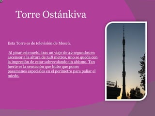 El documento describe varios lugares notables en Moscú, incluyendo la Torre Ostankino de 348 metros, las Colinas Vorobiovy con la Universidad Estatal de Moscú de 270 metros, la Colina Poklonnaya que conmemora las guerras de 1812 y la Segunda Guerra Mundial, y el Museo Kuskovo con su colección de más de 3000 piezas de cerámica y vidrio. También menciona la Plaza Roja, la tercera plaza más grande del mundo, y la Galería Tretiakov, el museo más