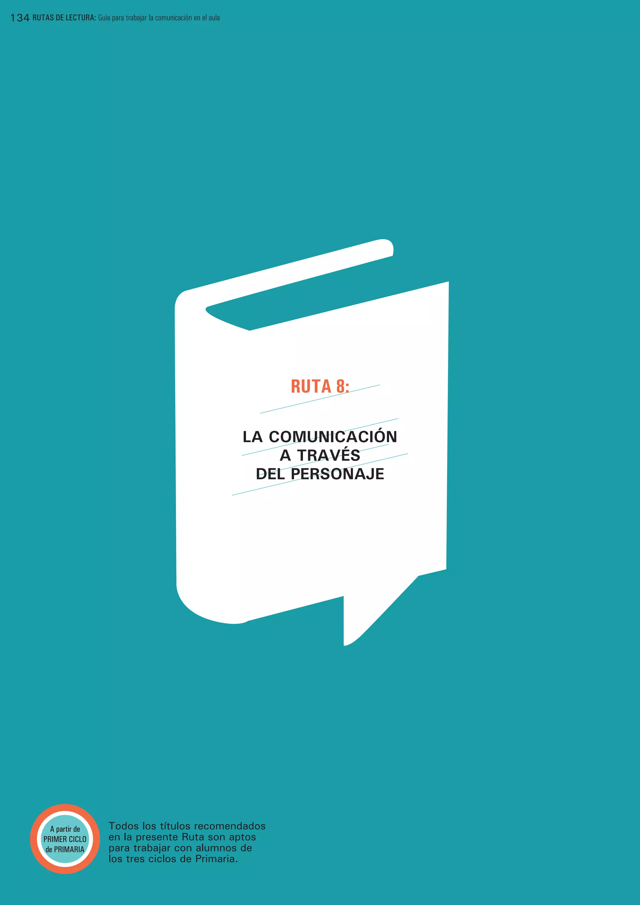 Este documento presenta la Ruta 8 de un libro sobre la comunicación en el aula. La ruta se enfoca en usar personajes literarios para enseñar. Introduce a Pomelo, un elefante pequeño que vive en un huerto y está lleno de preguntas, como los niños. El documento provee información sobre usar los libros de Pomelo en el aula, incluyendo leerlos en voz alta, conocer al personaje Pomelo, y actividades como crear un huerto de Pomelo usando materiales.