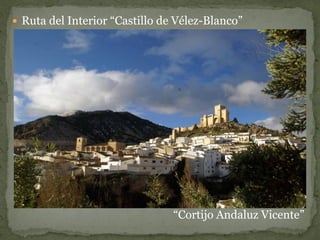Este documento proporciona información sobre rutas turísticas en el interior de Andalucía, incluyendo castillos, pueblos, atracciones naturales como las canteras de Macael y la Sierra de los Filabres, y museos. También incluye los números de teléfono para obtener información y hacer reservas en "Cortijo Andaluz Vicente".