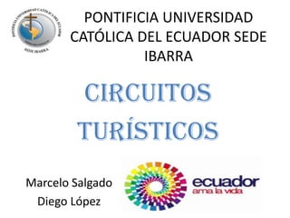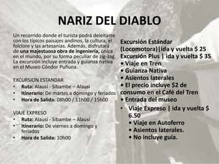 El documento presenta 6 circuitos turísticos en Ecuador, incluyendo información sobre la ruta, itinerario, hora de salida y costo de cada uno. Los circuitos son: Nariz del Diablo, Tren de la Libertad, Sendero de Arrozales, Machachi Festivo y Camino al Boliche, cada uno resaltando paisajes, cultura y atracciones diferentes.