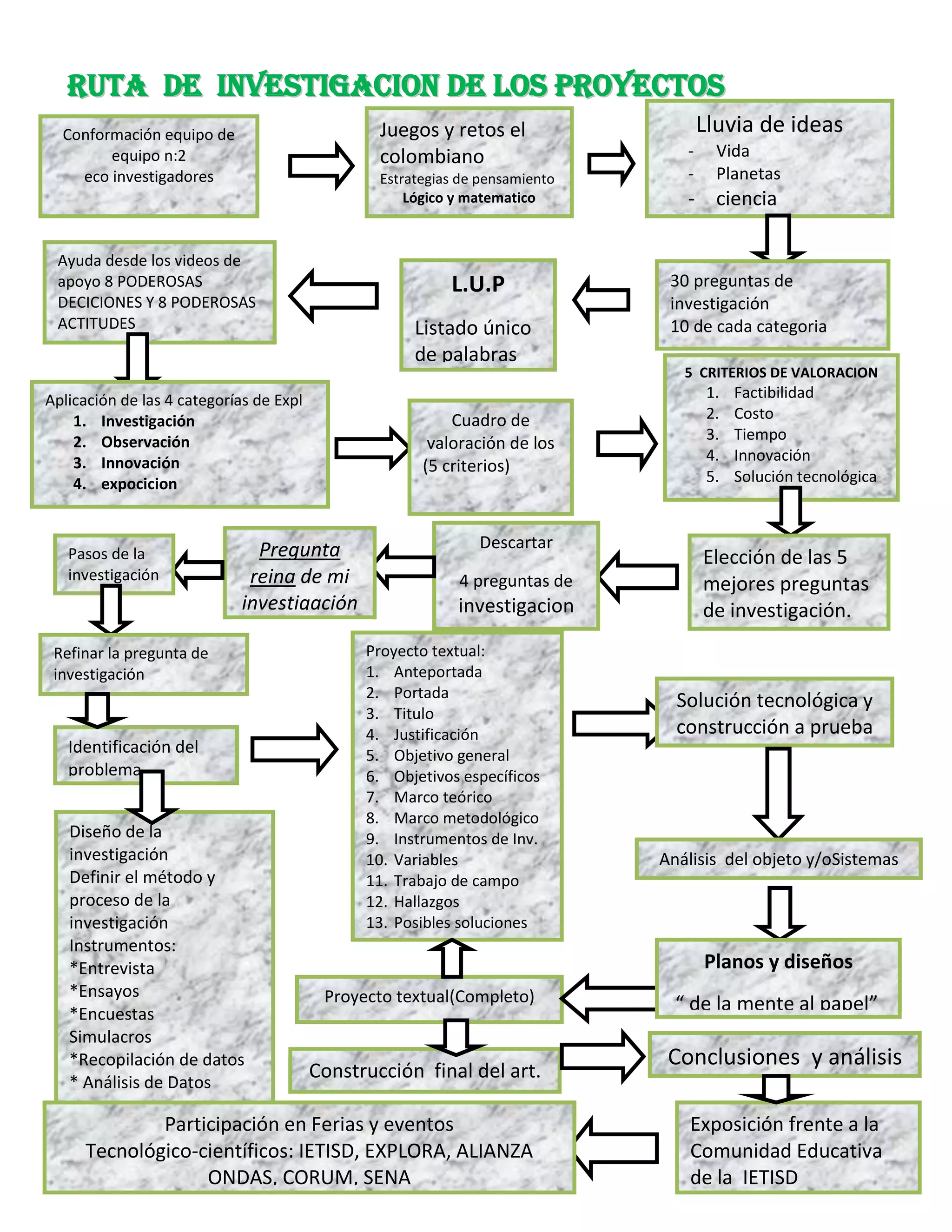 El documento presenta los pasos para realizar proyectos de investigación, incluyendo la conformación de un equipo de investigadores, la generación de preguntas de investigación en diferentes categorías, la selección de una pregunta principal, el diseño e implementación del proyecto con etapas como la recopilación y análisis de datos, y la construcción y exposición del proyecto final.