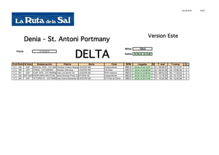 Este documento proporciona información sobre 5 embarcaciones que participaron en una regata de Denia a St. Antoni Portmany. Incluye detalles como el nombre de la embarcación, el patrón, el tipo de barco, el club y la hora de llegada de cada uno. La embarcación "ESP RADICAL CIEN - CAT MARINA" llegó en primer lugar, seguida de "ESP XTREM - CAT MARINA" en segundo y "ESP ICIAR DOS - CAT MARINA" en tercero.