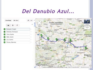 Este documento presenta una ruta turística de 10 días que recorre 6 países europeos siguiendo el curso del río Danubio, desde Budapest hasta Zúrich. El itinerario incluye visitas a ciudades como Bratislava, Viena, Linz, Múnich, Friburgo y Estrasburgo, así como lugares emblemáticos de la naturaleza como el lago Constanza, las cataratas del Rin y la Selva Negra. El documento proporciona un programa detallado de actividades y lugares a visitar en cada