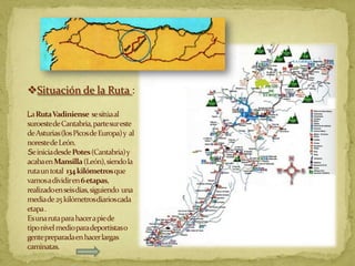La Ruta Vadiniense es una ruta alternativa poco conocida que conecta el Camino del Norte con el Camino Francés. La ruta de 6 días discurre por los Picos de Europa, visitando lugares históricos como el Monasterio de Sto. Toribio de Liébana. Los caminantes recorren el valle del río Deva y ascenderán al Puerto de Pandetrave antes de descender hacia Riaño y Sabero, donde se alojarán en albergues y conocerán la historia de la tribu prerromana de los Vadinienses.