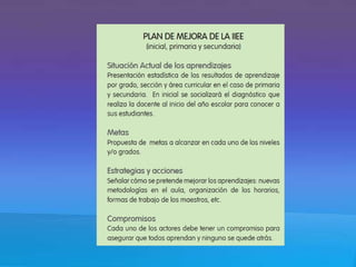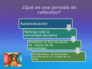 Este documento presenta información sobre jornadas de reflexión educativa. Explica que una jornada de reflexión involucra a toda la comunidad educativa para evaluarse a sí mismos, establecer planes de mejora para los aprendizajes de los estudiantes, y comprometerse a través de un acta. También cubre temas clave como los saberes previos de los estudiantes, el papel del docente, y factores que influyen en el logro de los aprendizajes.