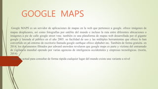 Este documento resume las características y usos de tres programas de la Web 2.0: Google Maps, YouTube y SlideShare. Google Maps ofrece imágenes de mapas y rutas entre ubicaciones. YouTube permite subir y ver videos de forma gratuita. SlideShare permite compartir presentaciones de diapositivas en línea.