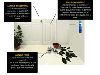 Este documento analiza cuatro anuncios publicitarios diferentes. Cada anuncio incluye un análisis conceptual sobre el mensaje que intenta comunicar, un análisis físico sobre lo que se observa en la imagen, y un análisis valorativo sobre la opinión acerca de la publicidad. Los anuncios promueven un ambientador, gel para el cabello, música balada y una pintura familiar.