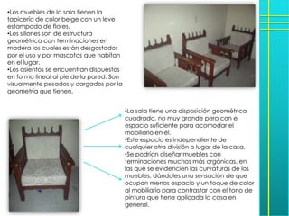 El documento describe las características de varias habitaciones de una casa, incluyendo una sala de costura con una mesa redonda, una sala con muebles geométricos desgastados, un baño con organización mejorable, un estudio sobrecargado y una habitación principal con muebles de madera. Se recomiendan cambios de diseño como muebles más orgánicos, unidades de almacenamiento y mejor aprovechamiento del espacio.