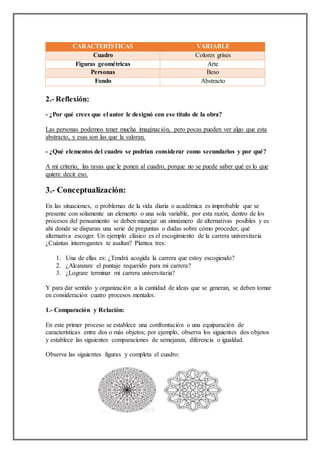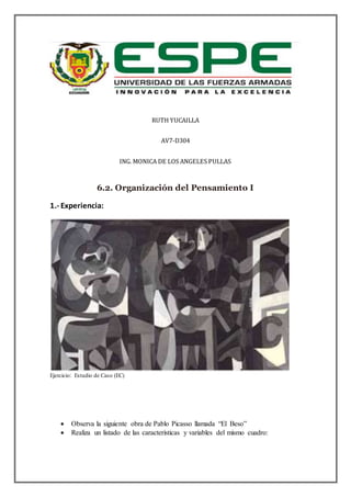 Este documento presenta un ejercicio sobre organización del pensamiento. Explica cuatro procesos mentales clave para organizar ideas: 1) comparación y relación, 2) calificación, 3) cambios y secuencias, y 4) jerarquías. Luego, pide al lector que aplique estos procesos a ejemplos como clasificar palabras y organizar un cronograma de actividades para un proyecto.