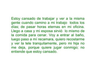 El hombre está cansado de su rutina diaria de trabajo y de ver siempre las mismas caras. Anhela descansar pero su esposa, hija y padre no se lo permiten. Un ser misterioso le dice que Dios lo ha mandado para llevarlo a descansar. El hombre se da cuenta que ha muerto y que su familia está bien cuidada. Pide una segunda oportunidad y despierta, dándose cuenta que solo fue una pesadilla.