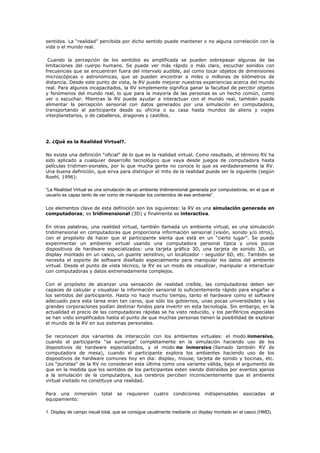 El documento describe la realidad virtual (RV) como una tecnología educativa prometedora. Explica que la RV permite a los estudiantes visualizar conceptos abstractos y experimentar entornos inaccesibles, lo que puede mejorar el aprendizaje. Aunque la RV se ha introducido principalmente en países desarrollados, también tiene potencial en otros países como Cuba, donde se ha comenzado a utilizar aunque de forma limitada.