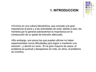 Este documento propone el uso de la realidad virtual como tratamiento para el trastorno por erección. Se describen tres escenarios virtuales graduales (bar, sala, habitación) que incluyen tareas de comunicación y desensibilización para superar la ansiedad de ejecución. La herramienta complementaría la terapia sexual tradicional al permitir la exposición sin necesidad de pareja. El objetivo final es reducir la ansiedad y recuperar la función eréctil a través de la terapia conductual en entornos virtuales controlados.