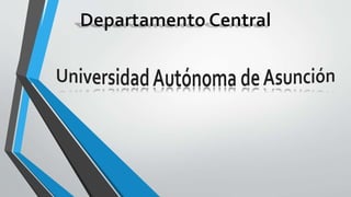 El documento proporciona información sobre el departamento Central de Paraguay. Ubicado en el centro-oeste del país, tiene una población de 2,221,180 habitantes y su actual gobernador es Blas Lanzoni. Algunos sitios turísticos recomendados incluyen las antiguas estaciones de ferrocarril construidas en 1859 y los cerros Koi y Chororí en Areguá. El autor del documento es Ricardo Daniel Valenzuela Bogado.