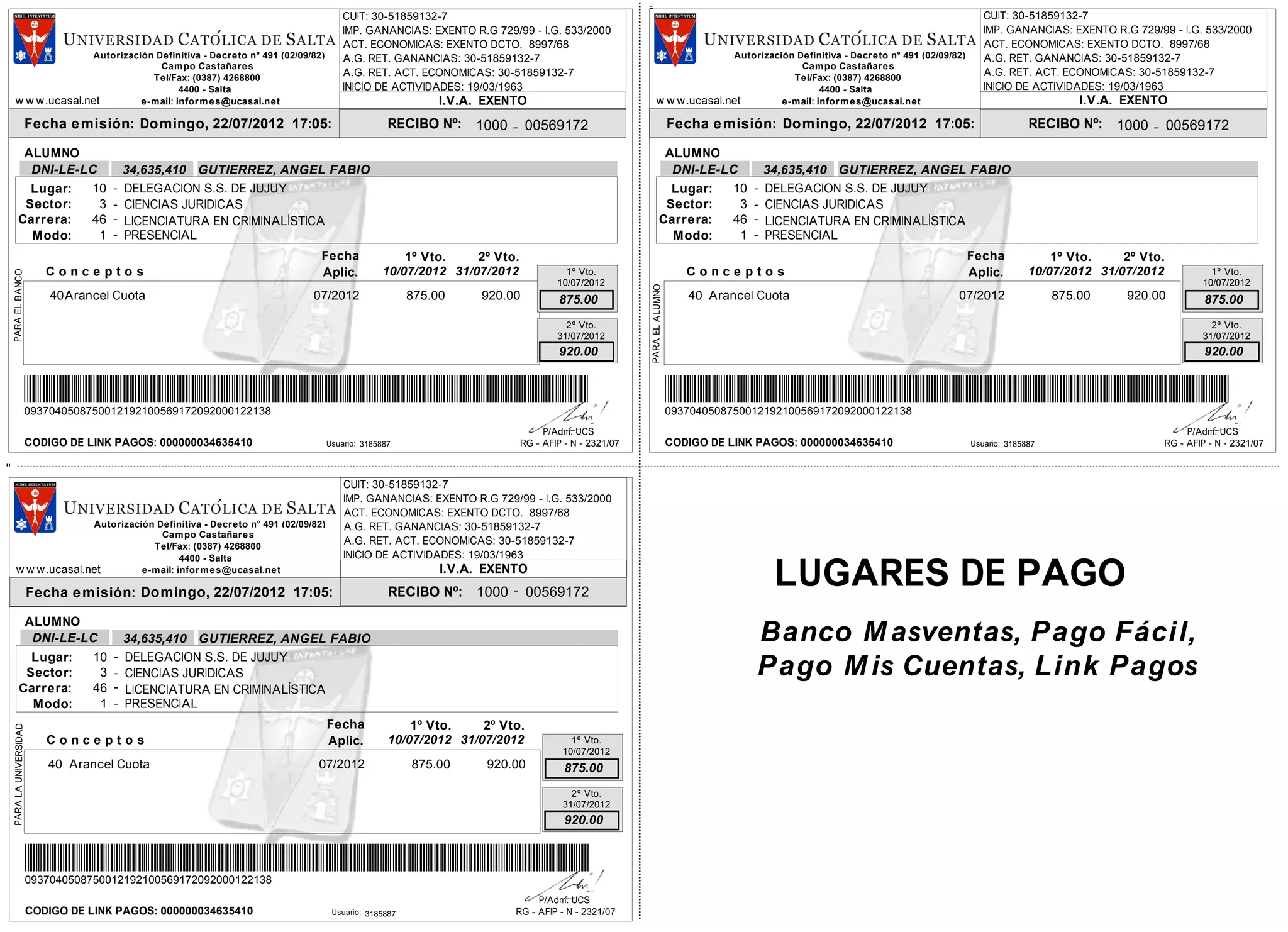 El documento es un recibo de pago emitido por la Universidad Católica de Salta a nombre de Angel Fabio Gutiérrez por una cuota de arancel de $875 correspondiente a julio de 2012, con vencimientos el 10 y 31 de julio. El recibo incluye datos de contacto de la universidad y del alumno.