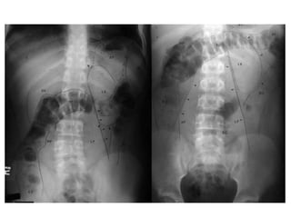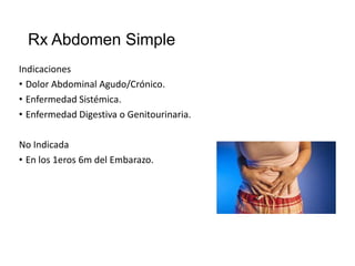 Este documento presenta las indicaciones, técnica y hallazgos normales y patológicos de la radiografía simple de abdomen. En 3 oraciones resume que la radiografía de abdomen es útil para evaluar dolor abdominal, enfermedades sistémicas o digestivas, describiendo los elementos anatómicos visibles, las diferentes proyecciones y cómo se leen las densidades radiológicas como hueso, aire y líquidos para identificar órganos y anomalías.