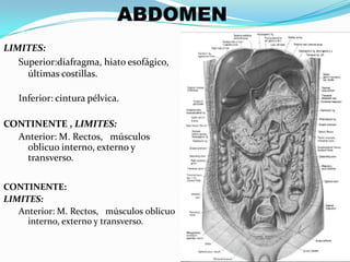 Este documento describe los límites y contenidos del abdomen, así como las principales proyecciones radiográficas utilizadas en un estudio de abdomen simple. Explica cómo interpretar cada proyección y qué se debe buscar, incluyendo la distribución del gas, niveles hidroaéreos y presencia de cálculos o masas. También resume las características normales y algunas causas comunes de acumulación anormal de gas dentro y fuera del intestino.
