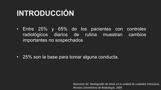 Este documento describe los hallazgos comunes en las radiografías de tórax de pacientes en la unidad de cuidados intensivos, incluyendo derrame pleural, cambios en la vascularización mediastínica, neumonía, broncoaspiración y edema pulmonar. También discute las limitaciones de las radiografías portátiles en UCI y muestra imágenes de dispositivos comunes como catéteres venosos centrales, tubos endotraqueales y drenajes torácicos.