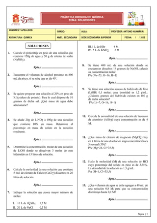 Este documento contiene las instrucciones y preguntas de una práctica de laboratorio sobre soluciones químicas. Se pide calcular varias cantidades relacionadas a soluciones, como porcentajes en peso, concentraciones molar y normal, y volúmenes requeridos. También se incluyen preguntas de opción múltiple sobre conceptos de soluciones. El documento está dirigido a estudiantes de secundaria y firmado por su profesor.