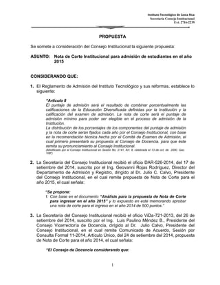 El documento propone establecer una nota de corte de 500 puntos para la admisión de estudiantes en el año 2015. Esto se basa en un análisis del comportamiento del proceso de admisión en los últimos años, que muestra un aumento proyectado en el número de solicitantes y estudiantes examinados. La nota de corte propuesta permitiría que más estudiantes tengan la oportunidad de competir por un cupo en las carreras, a la vez que se autoriza al Rector a disminuir la nota hasta 485 puntos para carreras específic