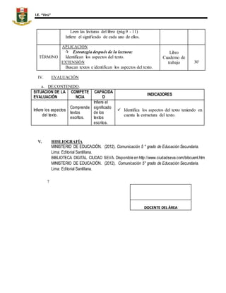 Este documento presenta la planificación de una sesión de aprendizaje sobre los tipos de texto para estudiantes de 5to grado. La sesión se divide en cuatro partes: 1) datos informativos sobre la sesión, 2) organización y objetivos de aprendizaje, 3) secuencia didáctica que incluye actividades para motivar, construir conocimiento y aplicar lo aprendido, y 4) evaluación del aprendizaje de los estudiantes. El propósito es que los estudiantes aprendan a diferenciar entre textos comunicativos, prag