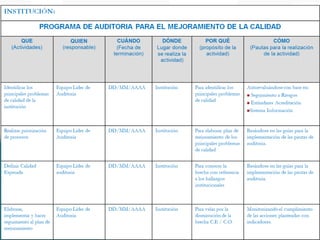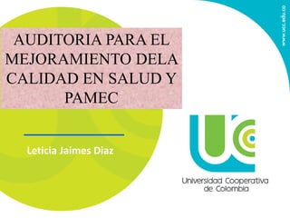 Este documento presenta una guía sobre auditoría para el mejoramiento de la calidad en salud. Explica conceptos clave como historia y objetivos de la auditoría, marco legal, tipos de auditoría y procesos de auditoría. Además, detalla los componentes y características del Programa de Auditoría para el Mejoramiento de la Calidad (PAMEC), el cual es el mecanismo para evaluar sistemáticamente la calidad observada respecto a la calidad esperada en la atención de salud.