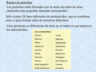 El documento describe el proceso de síntesis de proteínas en dos etapas. Primero, la transcripción convierte el ADN en ARN mensajero en el núcleo. Luego, la traducción usa el ARN mensajero para ensamblar proteínas a partir de aminoácidos en el citoplasma, guiado por el código genético de tres nucleótidos. El proceso garantiza que la información genética se exprese en forma de proteínas funcionales.