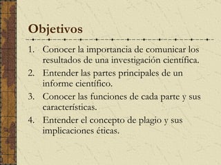Este documento proporciona instrucciones sobre cómo escribir un informe científico. Explica las partes principales de un informe científico, incluido el título, resumen, introducción, materiales y métodos, resultados, discusión y conclusión. También cubre temas como citas bibliográficas, tablas y gráficos. El objetivo es enseñar a los estudiantes a comunicar efectivamente los resultados de una investigación científica.