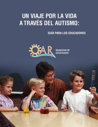 Este documento presenta una guía para educadores titulada "Un viaje por la vida a través del autismo: Guía para los educadores". La guía ofrece información sobre el autismo y estrategias para educar a estudiantes con autismo. Incluye un plan de seis pasos para capacitarse, involucrar a los padres, preparar el salón de clases, educar a compañeros, implementar programas educativos y manejar cambios de conducta. También incluye apéndices con recursos útiles.