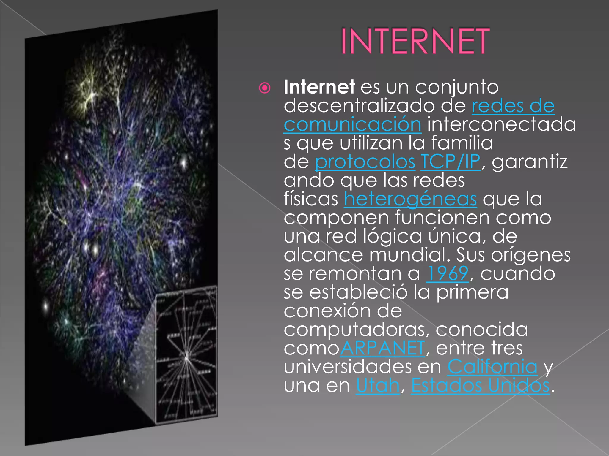 Internet es una red descentralizada de redes interconectadas que utilizan protocolos TCP/IP para funcionar como una red lógica única a nivel mundial. Sus orígenes se remontan a 1969 con la creación de ARPANET, la primera red de computadoras entre universidades en California y Utah.