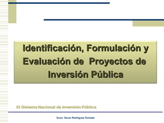 Este documento describe el Sistema Nacional de Inversión Pública de Perú (SNIP), el cual busca mejorar la calidad de los proyectos de inversión pública a través de la aplicación del ciclo de proyecto. Explica los conceptos clave como proyecto de inversión pública, ciclo de proyecto e identificación, formulación y evaluación de proyectos. También cubre temas como objetivos del SNIP, niveles de estudios requeridos y contenido mínimo del perfil de proyectos.