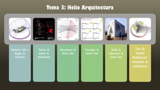 El documento presenta una introducción a la geometría solar y los ángulos de incidencia, así como técnicas para analizar el asoleamiento como diagramas solares, el uso de herramientas como el heliodón y software de simulación. Explica estrategias de diseño de dispositivos de control solar y cómo evaluarlos mediante un caso de estudio que modela el asoleamiento para determinar los requerimientos de protección solar.