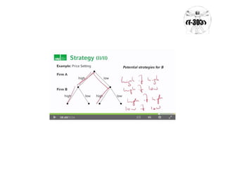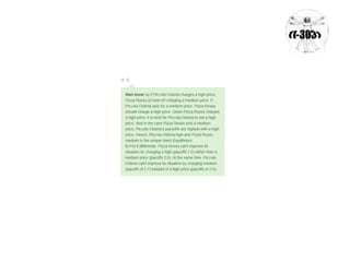 Este documento presenta un ejemplo de un juego de estrategia entre dos empresas de pizza, Pizza Hut y Domino's. Se describe el escenario del juego donde las empresas pueden fijar sus precios en alto, medio o bajo. También se presenta una matriz que muestra los pagos para cada combinación de estrategias. El objetivo es encontrar el equilibrio de Nash mediante la eliminación de estrategias sometidas.