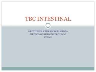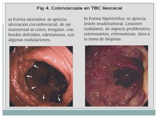 Este documento describe la tuberculosis intestinal y peritoneal (TBC EP), incluyendo su patogenia, manifestaciones clínicas, exámenes de diagnóstico y criterios de certidumbre. La TBC EP generalmente es secundaria a una lesión pulmonar y compromete principalmente entre los 11 y 40 años. Los síntomas incluyen dolor abdominal, diarrea, estreñimiento y fiebre. El diagnóstico se basa en exámenes como radiografías, endoscopias, cultivos de bacilos y biopsias para identificar granulomas.