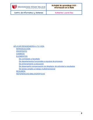 ★ El documento introduce el concepto de reingeniería aplicado no solo a procesos organizacionales sino también al comportamiento humano. Explica que la reingeniería busca cambiar radicalmente los hábitos de comportamiento de las personas mediante un profundo conocimiento de los individuos. Señala algunos de los cambios que implica como pasar de departamentos funcionales a equipos de procesos y de tareas simples a trabajo multidimensional.