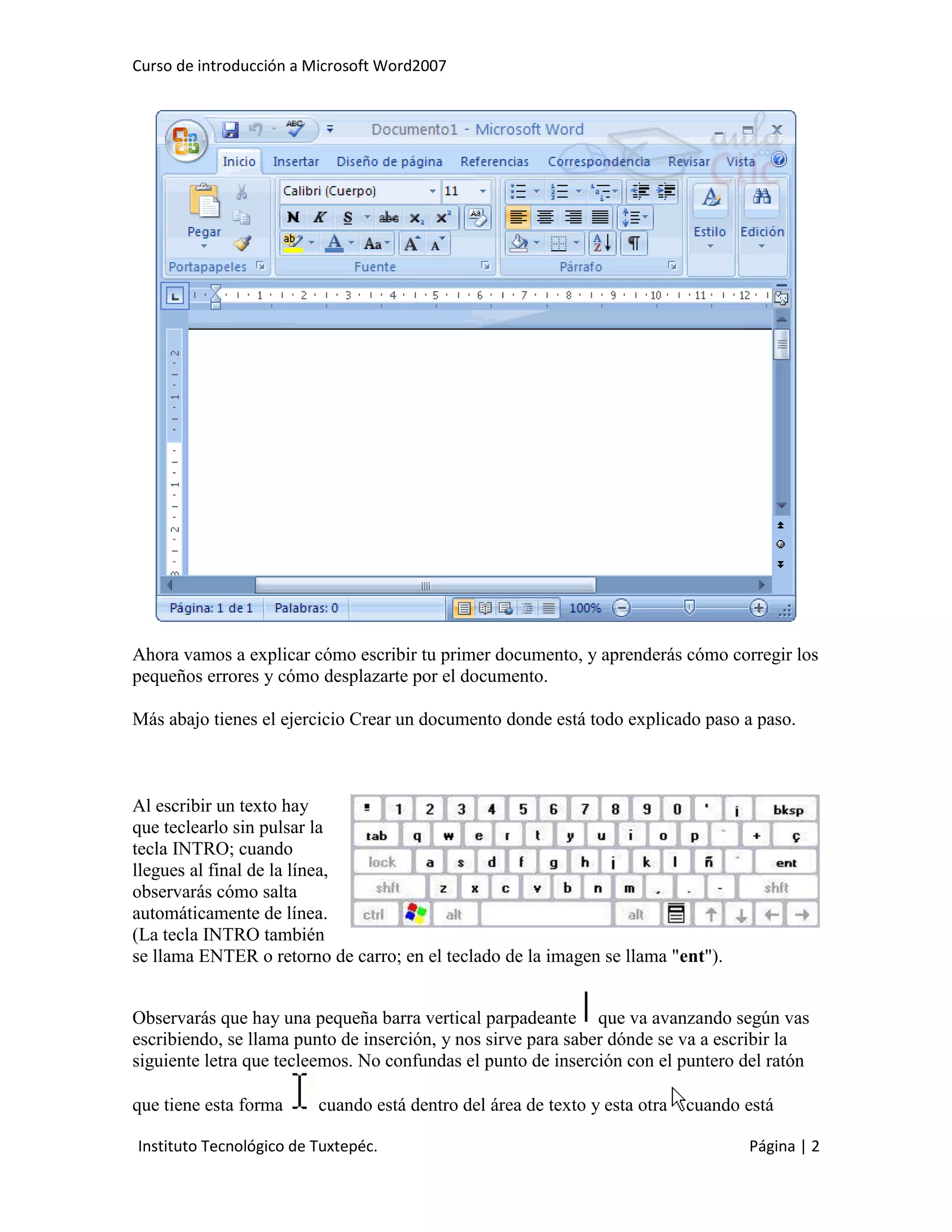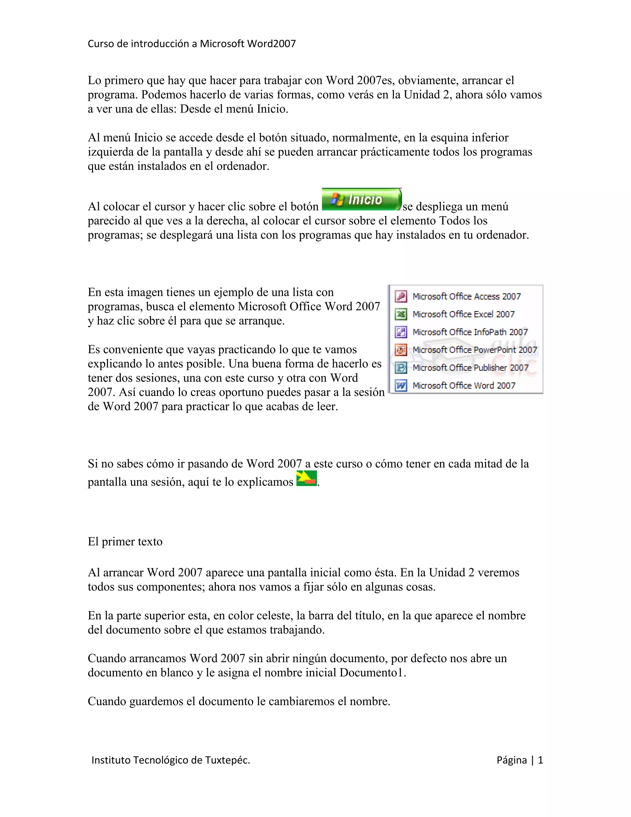 Para trabajar con Word 2007, se debe iniciar el programa desde el menú Inicio. Una vez iniciado Word 2007, aparece una pantalla inicial con una barra de título en la parte superior donde se muestra el nombre del documento. Al iniciar sin documentos abiertos, se crea un documento en blanco llamado "Documento1". El texto se escribe sin presionar la tecla Enter y el punto de inserción indica dónde se escribirá el próximo carácter.