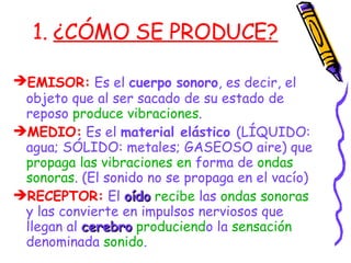 El documento explica cómo se produce el sonido. El sonido se produce cuando un cuerpo sonoro vibra y transmite ondas sonoras a través de un medio elástico como el aire hasta llegar al oído, donde se convierten en impulsos nerviosos que el cerebro interpreta como sensación de sonido. Define el sonido como la sensación que se produce en el cerebro al recibir el oído las ondas sonoras. Finalmente, describe diferentes tipos de fenómenos sonoros como el sonido natural, ambiental, musical, la música, el silencio
