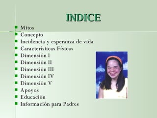 El documento proporciona información sobre el síndrome de Down. Explica que se trata de una condición genética causada por la presencia de un cromosoma extra, el cual afecta el desarrollo físico y cognitivo de la persona. Describe las características físicas y habilidades típicas de quienes lo padecen, así como recomendaciones para brindar educación y apoyo a lo largo de la vida. Resalta que con los cuidados adecuados la esperanza de vida de estas personas ha aumentado considerablemente.