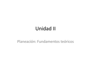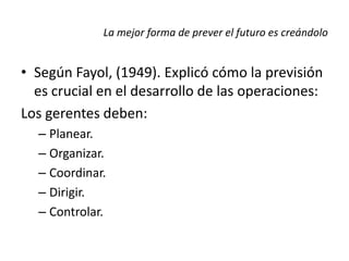 El documento describe los fundamentos teóricos de la planeación. Explica que, según Fayol, la planeación es crucial para el desarrollo de las operaciones y que involucra planear, organizar, coordinar, dirigir y controlar. También discute las funciones ejecutivas de la planeación según Allen, como la definición de objetivos y programación. Finalmente, describe diferentes tipos de planeación por tamaño, forma, propósito y duración.